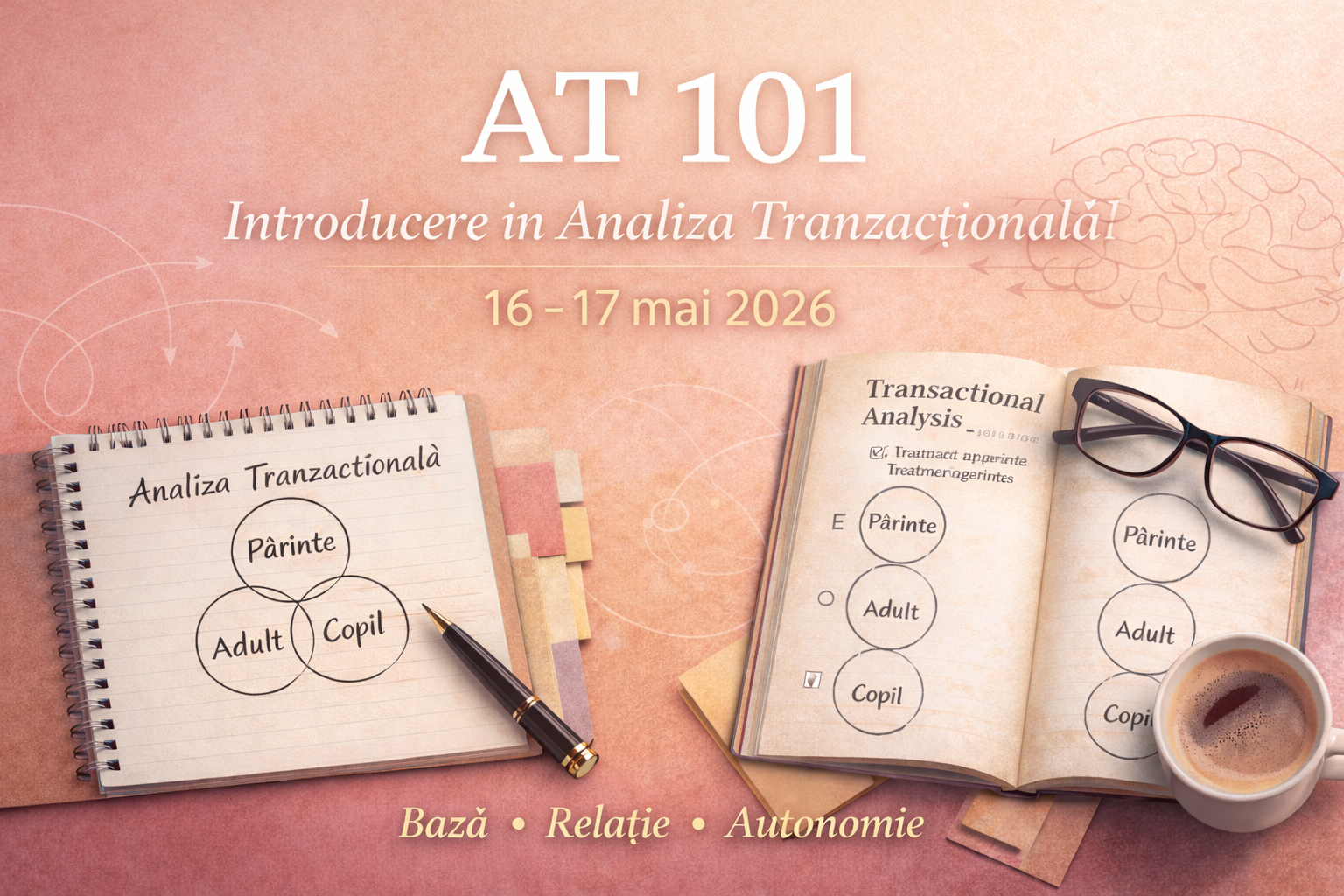Aprofundează Analiza Tranzacțională și obține 12 credite CPR prin cursul AT 101. Acest curs online oferă o bază solidă în concepte esențiale precum stările eului, tranzacții și scenarii de viață. Perfecționează-ți practica terapeutică alături de Draghici Roxana, PTSTA-P.